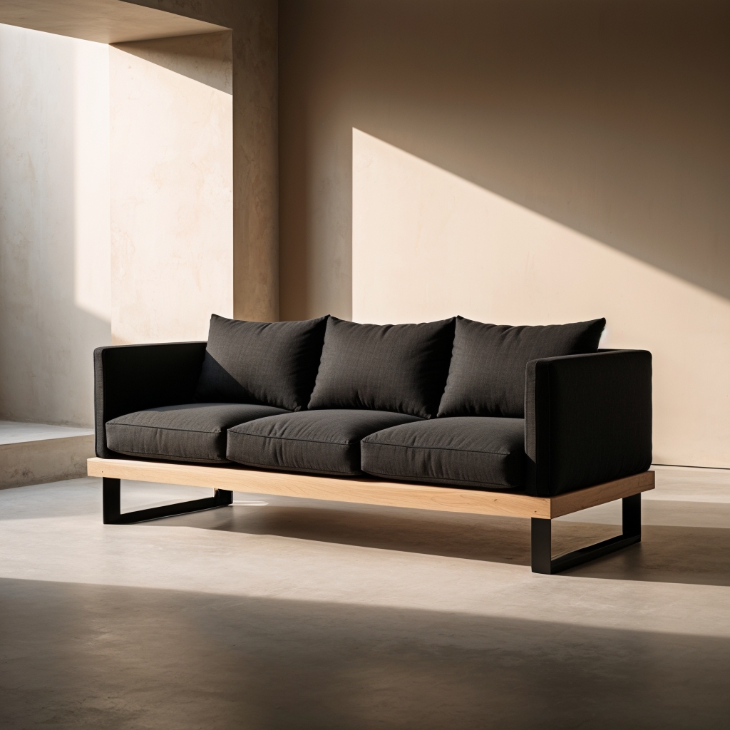 Los cojines, tapizados en lino negro de alta densidad, ofrecen firmeza y contención, sin sacrificar suavidad. Su base estructural está compuesta por herrería de alta gama en tono negro profundo con acabado mate cepillado, tratado con proceso térmico de oxidación controlada para máxima durabilidad y elegancia sobria.